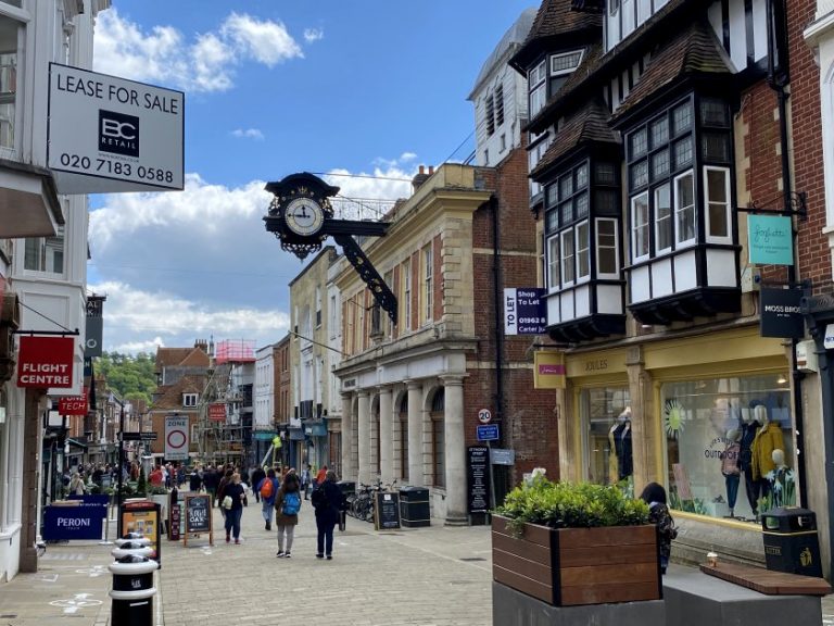 Today’s breakfast was at Caffè Nero on Marlborough’s High Street, after which it was back to the Premier Inn for showers and packing. Our next destination was the ancient city of Winchester, less than 40 miles distant. Winchester’s modest population figure of 45,000 belies its historical significance. Founded in Roman times, it had been (prior to the 11th-century Norman conquest) the most important city in England. Today it contents itself with being the county town of Hampshire, outranking far larger settlements like Southampton, Portsmouth and Basingstoke. Winchester is also believed to be one of the UK’s most affluent areas.