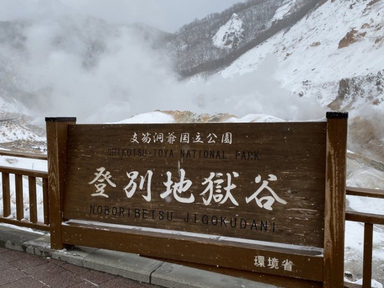 We soon left for a walk along ‘Hell Valley’ (Jigokudani), situated a little bit above the resort town and forming part of the Shikotsu-Toya National Park. There was lots of geothermal activity in evidence, providing the spa waters for the town. As ever in such places, there was also a pungent smell of sulphur. Water leaves the ground at around 60C and cools as it flows down to the town.